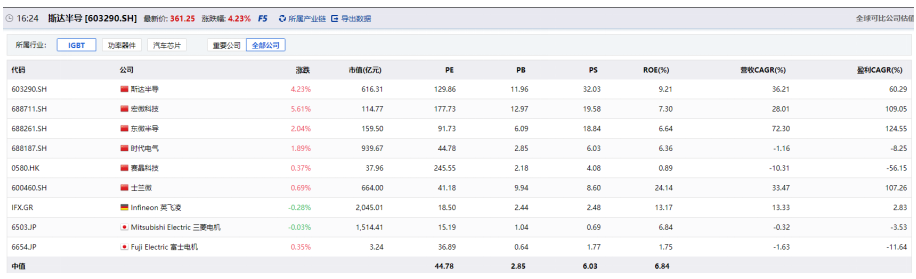 逆变器的核心零部件是IGBT,往往核心零部件是利润最丰厚的一端,同时PE也相对较高。对比发现,部分IGBT企业的PE中值是44.78。