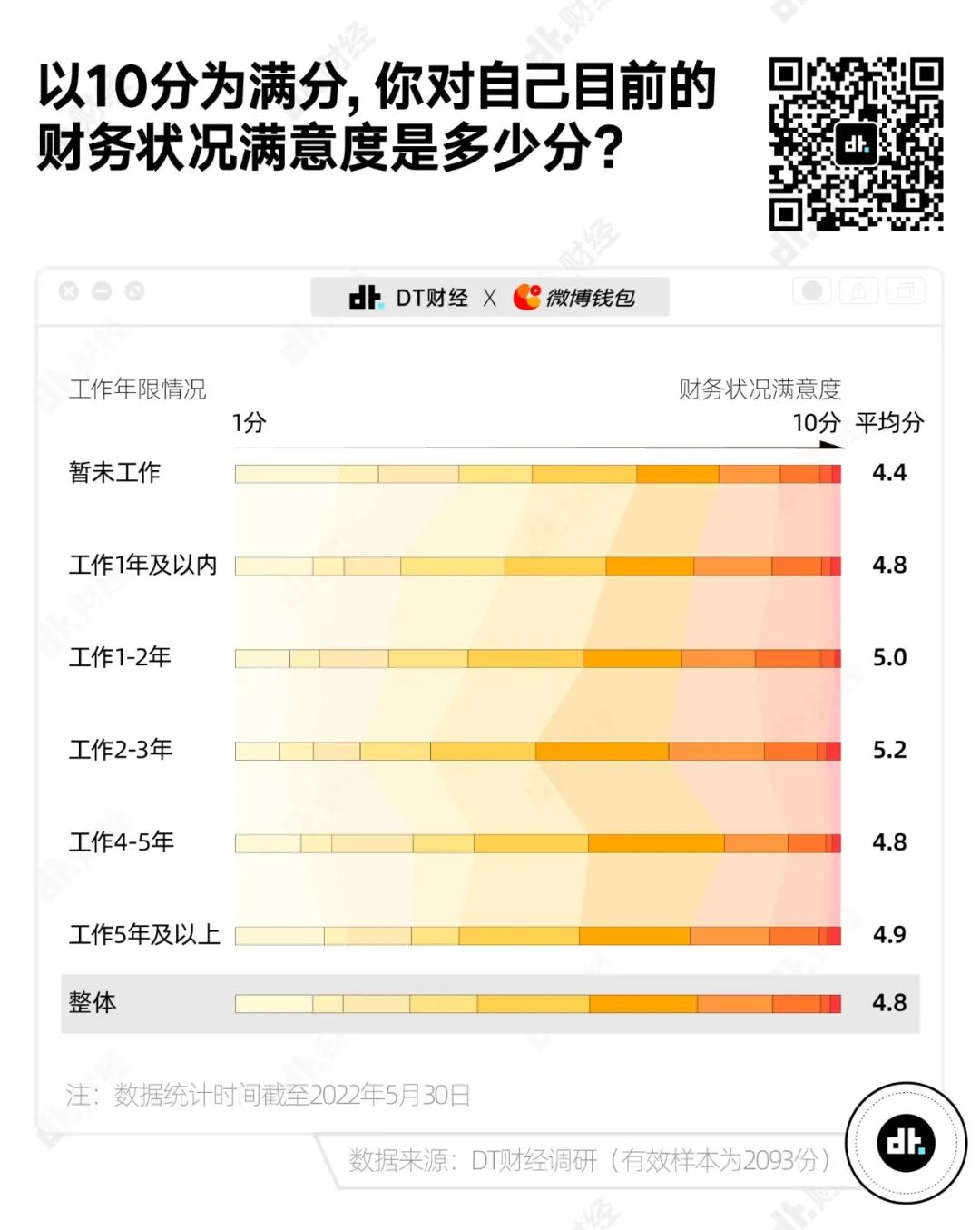 不管存款多少,年轻人普遍对自己的财务状况不太满意。以10分为满分,受访年轻人给自己的财务状况平均打了4.8分,不及格。