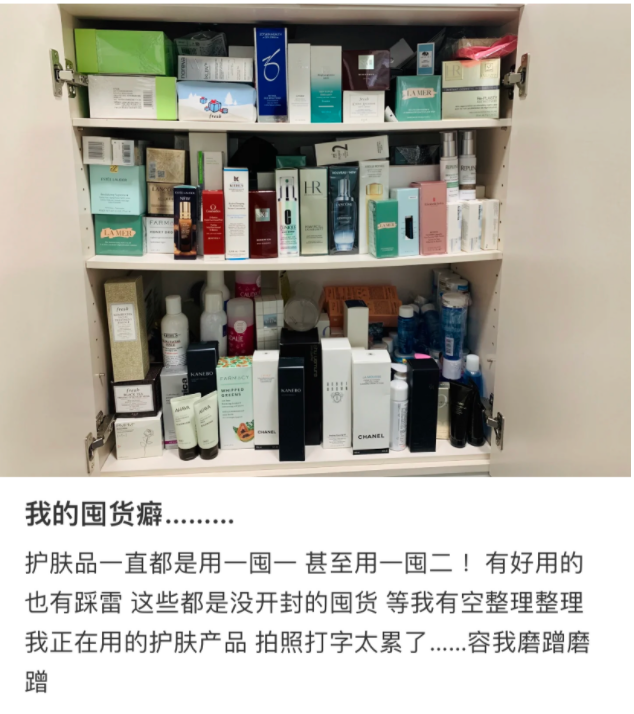有用户囤积的大牌护肤品已经将柜子压弯图源 / “爱吃榴莲的DD”