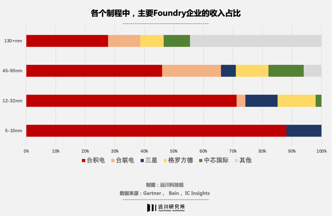 在代表先进制程的5-10nm工艺上,台积电一个人拿走了全行业近九成的营收,三星则是先失去了苹果这个大客户,又因为5nm良率问题吓跑了高通和英伟达,期间还因为日本断供光刻胶,打乱了生产节奏。