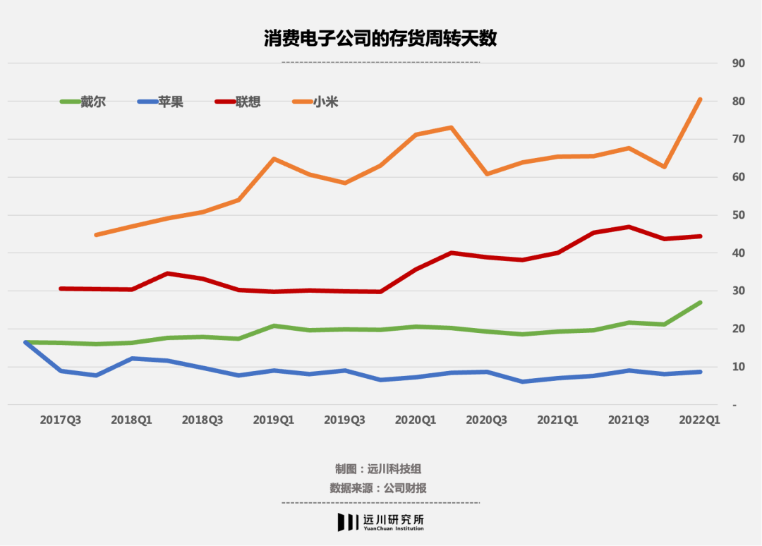 除了供应链管理大师苹果,其他消费电子公司的存货周转天数都在增加