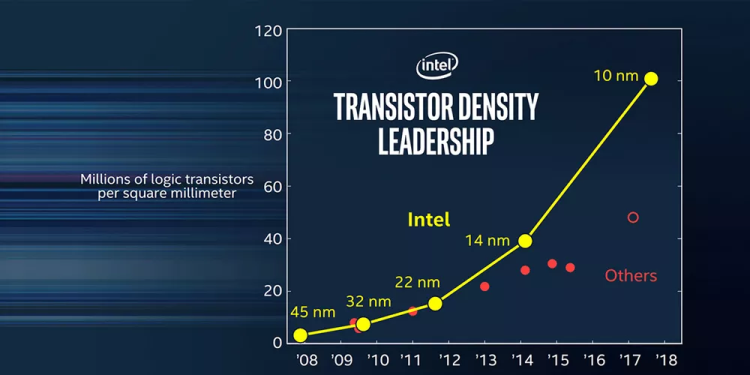 其实英特尔的说法并没有错,大部分人印象中,制程纳米数越小,代表工艺越先进。但真正衡量芯片制程工艺的核心指标,其实上“逻辑晶体密度”——只有密度越高,产品才越先进。把英特尔拖到2019年才量产10nm和友商的7nm对比,这个核心指标其实是差不多的。