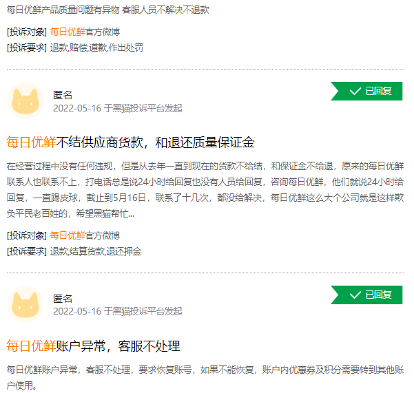 今年上半年,已有数位供应商在黑猫投诉上投诉每日优鲜拖欠货款,“2021年底开始,常州每日优鲜分部一直以各种理由拖欠货款,并威胁供应商不供货,所有货款都不结,导致供应商供货到今年2月底,被拖欠103万货款。”