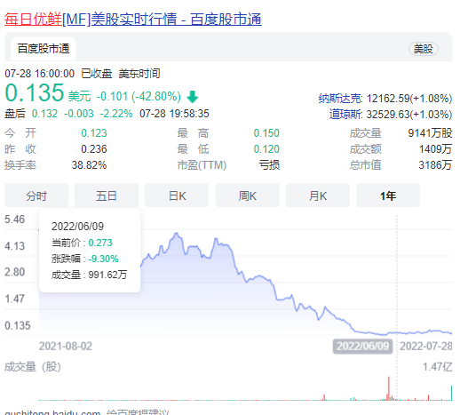 2021年6月,每日优鲜在美上市,发行价13美元/股,以此计算其当时市值为32亿美元;上市首日,股价即破发;受7月28日解散、破产传闻影响,每日优鲜股价再度大跌近50%,跌至0.135美元,总市值3186万美元,远低于此前数轮的融资额。今年6月,由于股价连续30个交易日跌破1美元,每日优鲜已收到纳斯达克的退市通知函。