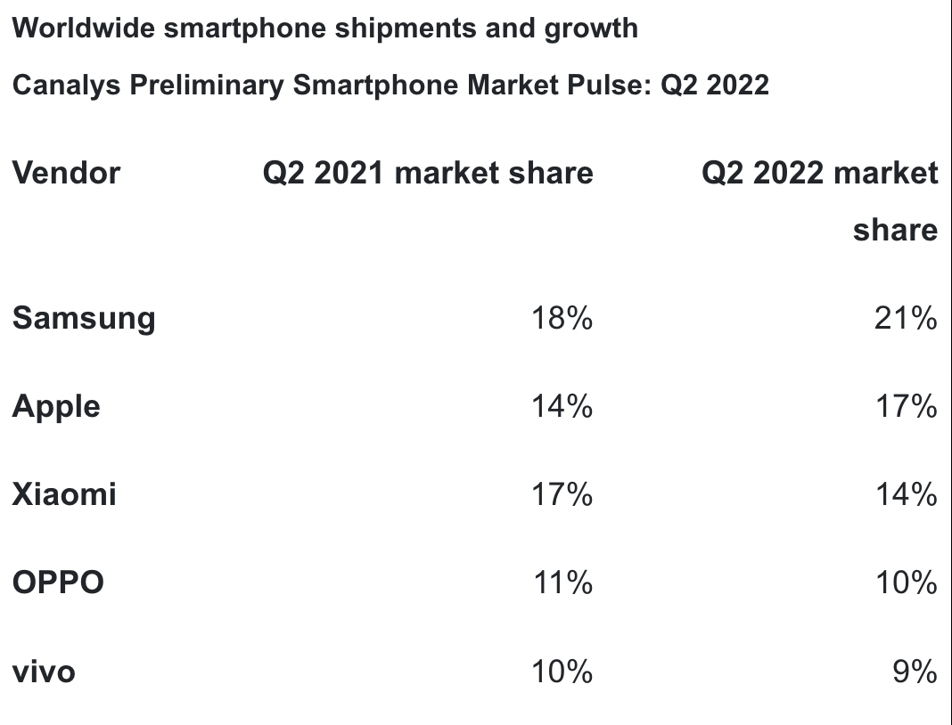 2022年Q2个品牌手机市场份额 数据来源:Canalys