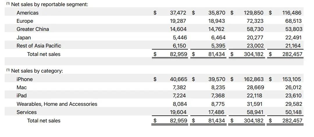 细分来看,第二季度来自美洲地区的营收为374.7亿美元,高于去年同期的358.7亿美元;来自欧洲地区的营收为192.9亿美元,高于去年同期的189.4亿美元;来自大中华地区的营收为146亿美元,略低于去年同期的147.6亿美元;来自日本的营收为54.5亿美元,低于去年同期的64.6亿美元;来自亚太其他地区的营收为61.5亿美元,高于去年同期的54亿美元。