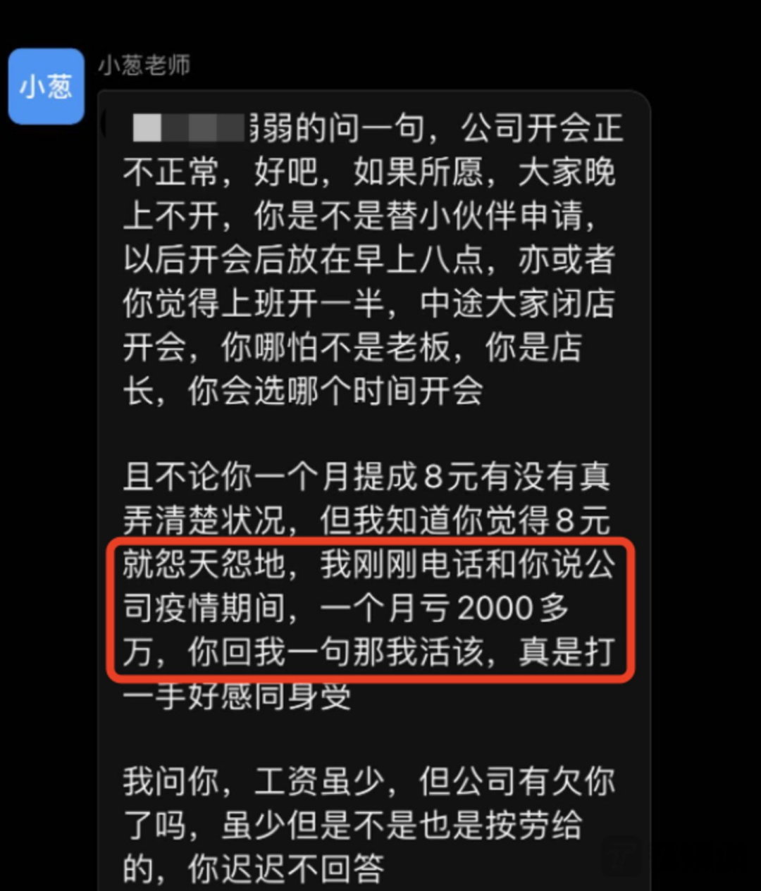 2021年年底,茶颜悦色员工群吵架记录被爆出,有员工在企业钉钉大群,对到手工资表达不满,但昵称小葱老师的吕良却亲自下场回复,说出了“你觉得8元就怨天怨地,疫情期间公司一个月亏2000多万。我问你工资虽少,但公司有欠你吗?”这样的话。