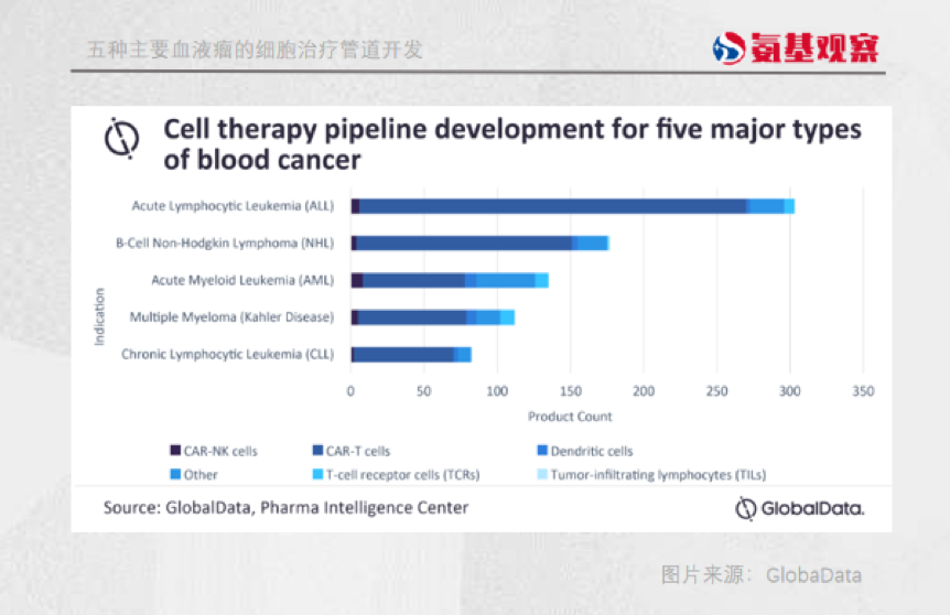 根据GlobalData 数据,目前有800多种针对血液瘤的细胞疗法处于临床阶段,其中绝大多数是CAR-T疗法。