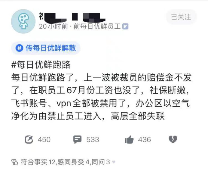 对于裁员一事,早在7月上旬就已有每日优鲜员工在脉脉上进行爆料。有认证为每日优鲜前员工的用户称,“在职员工6、7月份工资也没了,社保断缴”等。另有员工称,每日优鲜裁员从3、4月份便已开始,原来2000多名员工,现今不足900人。