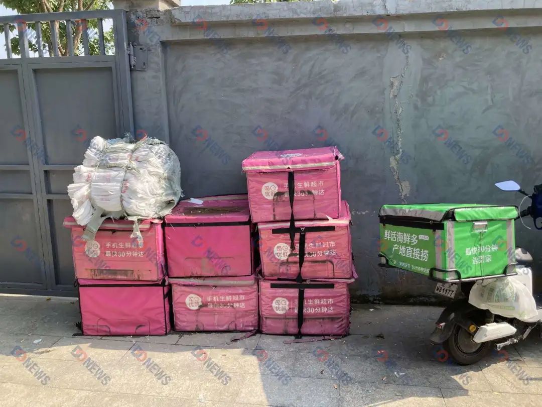 图注:前置仓门口每日优鲜和美团买菜的箱子