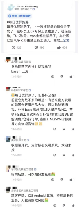 另外,与每日优鲜官方对裁员一事,委婉的回应相比,脉脉上员工的讨论、“友商”的挖角动作以及在舆论场上引发的讨论,则更加直接。