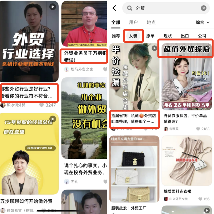 “穿搭”是种草类内容的top类目,包含“外贸”“古着vintage”以及最新爆火的“新中式”等种草话题。剁主一开始在可颂搜索“外贸”一词,推荐的是“外贸的行业选择”“中国做进出口面临的三大问题“等知识类内容。