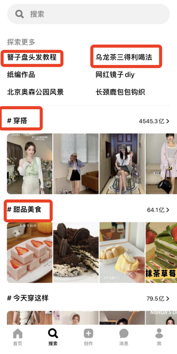 与此同时,运营人员人工设置的热搜词、推荐话题都有浓浓的种草味道,“簪子盘头发教程”“乌龙三得利喝法”“网红镜子diy“等热搜词都是近期用户在抖音参与度最高的生活经验方式,“穿搭”“甜品”“美食”等推荐话题则在引导用户关注“生活指南”。