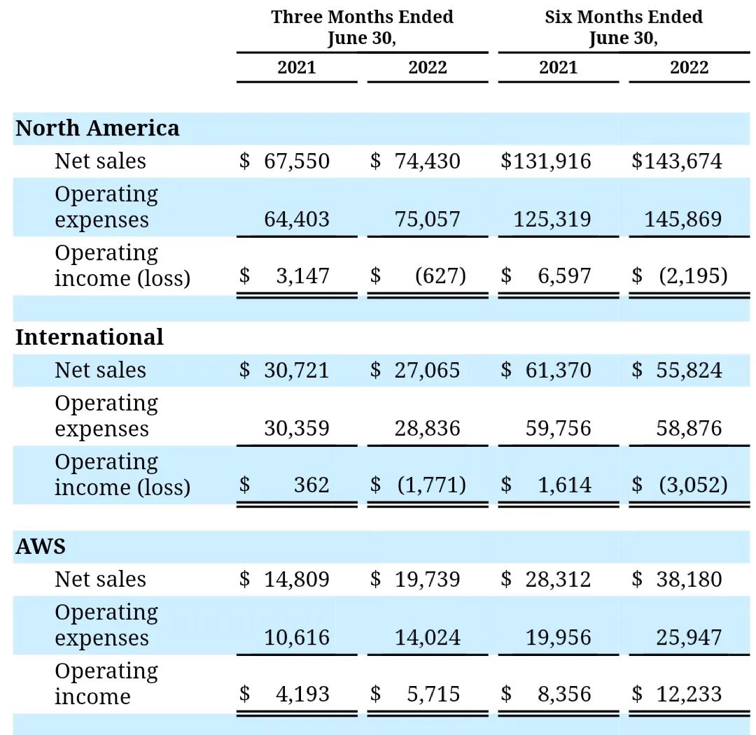 本季度,亚马逊电商业务销售额同比下降4%,多个国际市场的电商销售额都在下滑,北美、国际电商业务分别亏损了6.3亿、17.7亿美元。