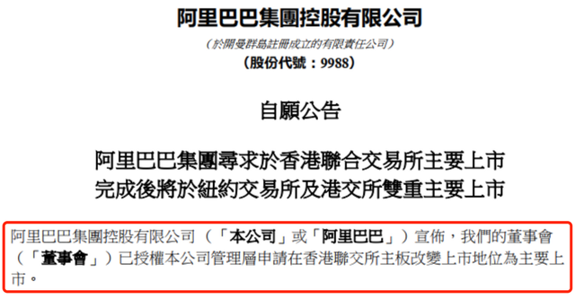 7月26日,阿里巴巴发布公告称,将谋求集团在香港联交所主板的上市地位更改为“主要上市”,相关主要上市流程预计将于2022年年底前完成。
