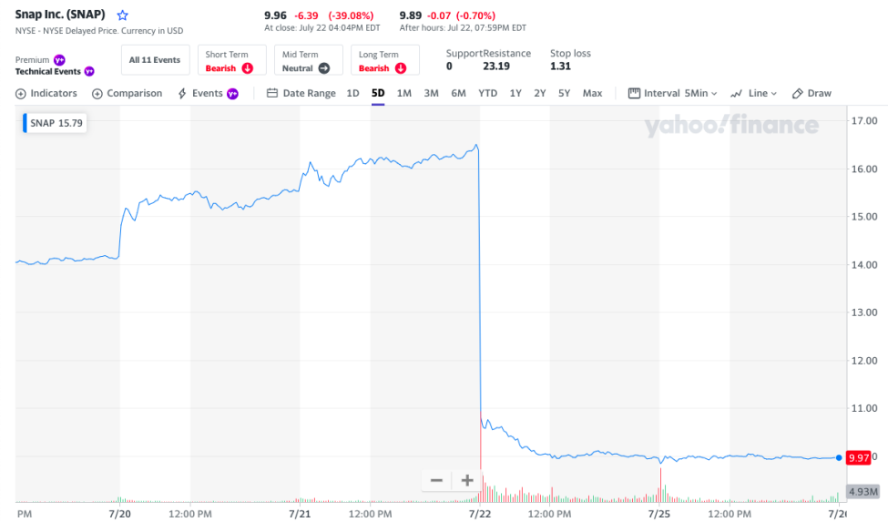 7月21日,在公布又一个令人失望的季度业绩之后,社交媒体Snapchat母公司Snap股价跌逾25%。截至7月22日收盘,这一数字已扩大至39%。今年以来,Snap股价已下跌近七成,公司市值较2021年9月峰值更是蒸发88%。数百亿市值被抹去——Snap比波动性巨大的加密货币跌得更为惨烈。