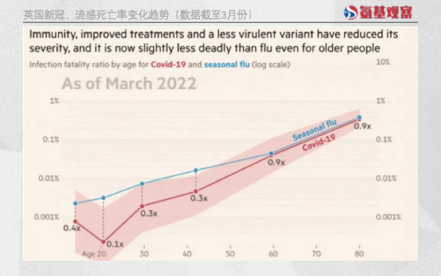 因为从毒性来看,Omicron似乎要温和不少。2020年,COVID-19平均病死率是流感的17.5倍。但随着疫苗的接种,即便完全放开,英国Omicron毒株的致死率,一度不如流感。
