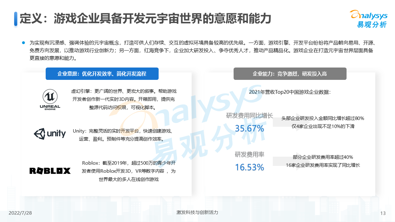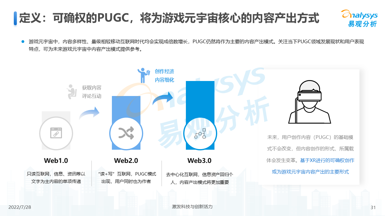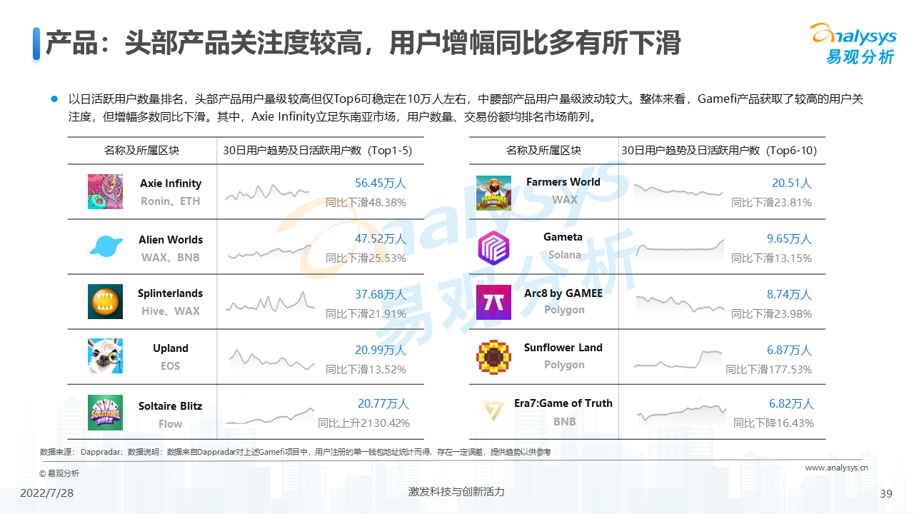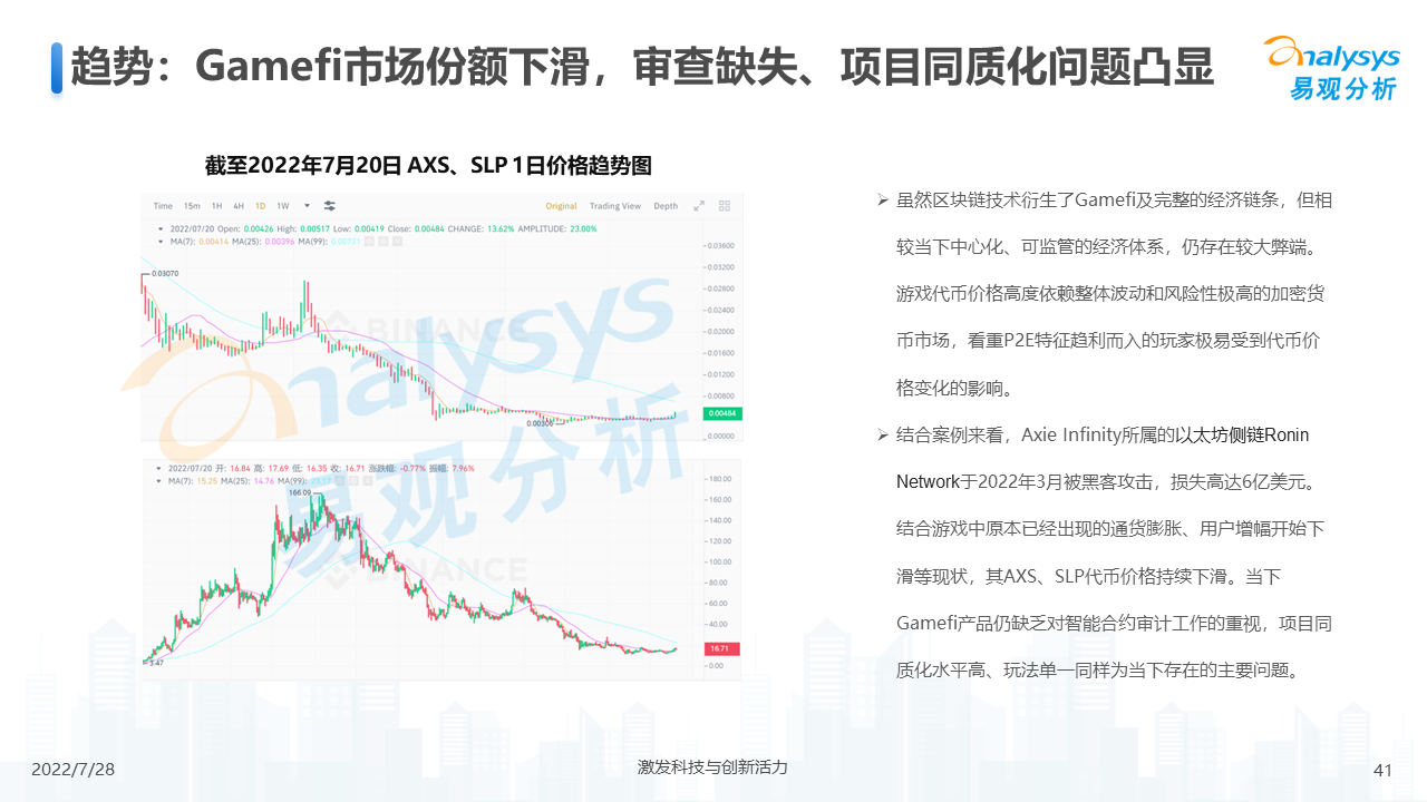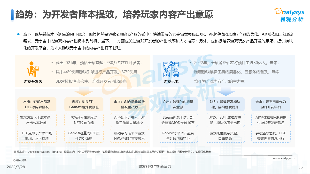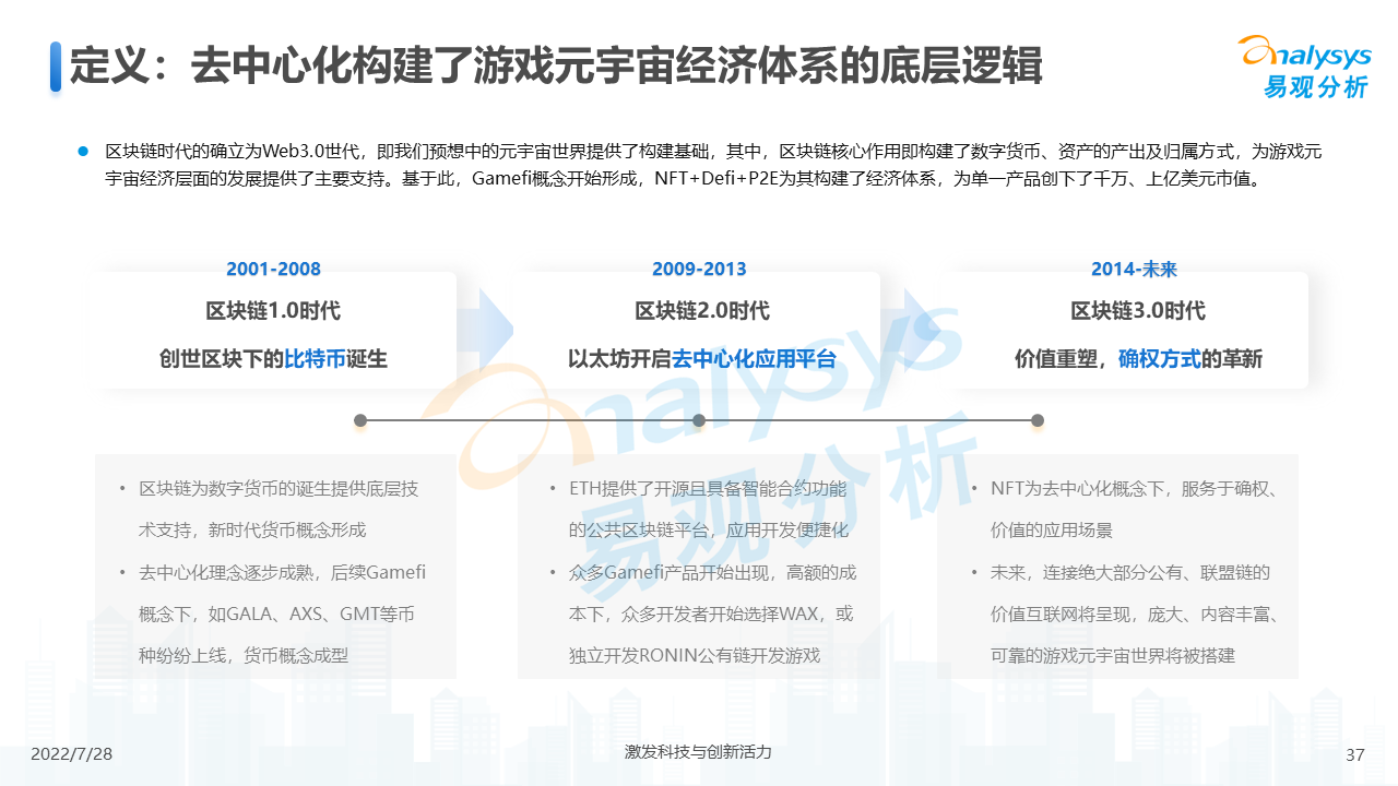 文 | 易观分析随着区块链、XR等领域技术的快速发展,元宇宙也在从概念开始逐步落地,NFT、Gamefi等应用场景涌现。游戏作为天然具备虚拟空间、力求玩家沉浸感的娱乐性产品,与元宇宙概念高度契合,具备较强关注、分析价值。