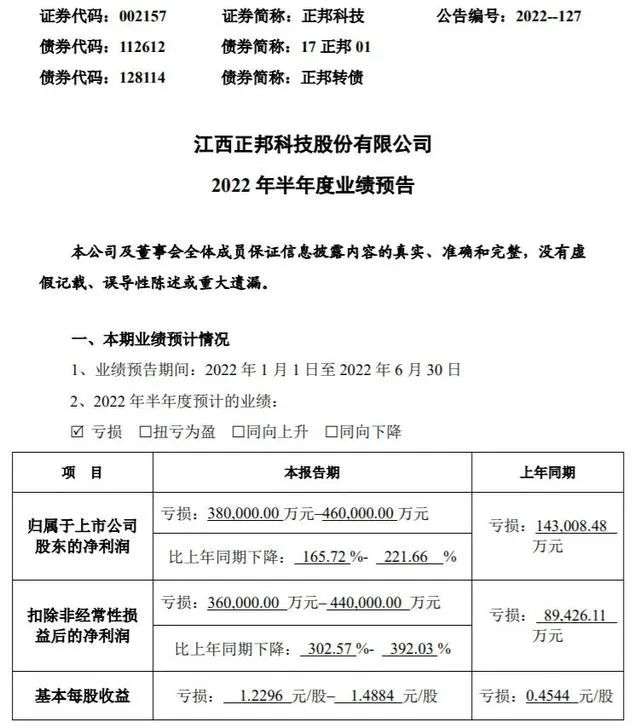 财报显示,2021年,正邦科技亏损188.19亿元。2022年Q1,正邦科技又亏损了24.33亿元。2022年半年度业绩预告显示,今年上半年,正邦科技预计亏损38-46亿元,同比亏损扩大165.72%-221.66%。