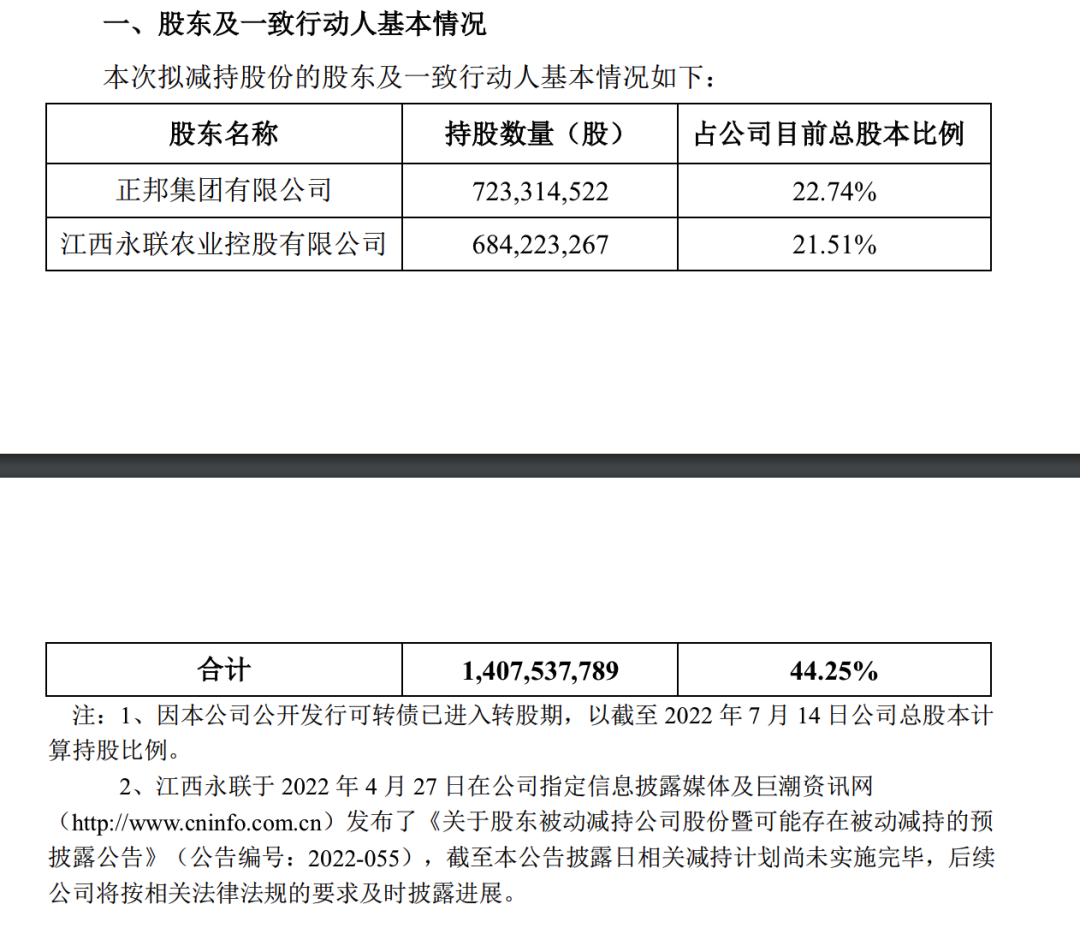比如,2022年7月16日,正邦科技发布了减持股份预披露公告。公告显示,控股股东正邦集团以及一致行动人江西永联,拟在公告披露之日起15个交易日之后的六个月内以集中竞价交易合计减持不超过6362万股(不超过公司总股本的2%)。