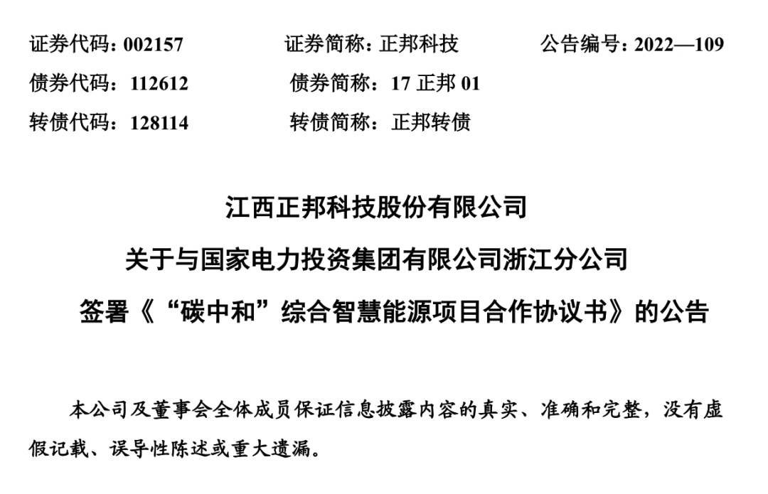2022年6月17日,正邦科技与国家电投签订了《“碳中和”综合智慧能源项目协议书》。双方将在投资开发光优、风电、综合智慧能源等项目建设等方面建立合作,三年内预计投资总额为400亿元左右。