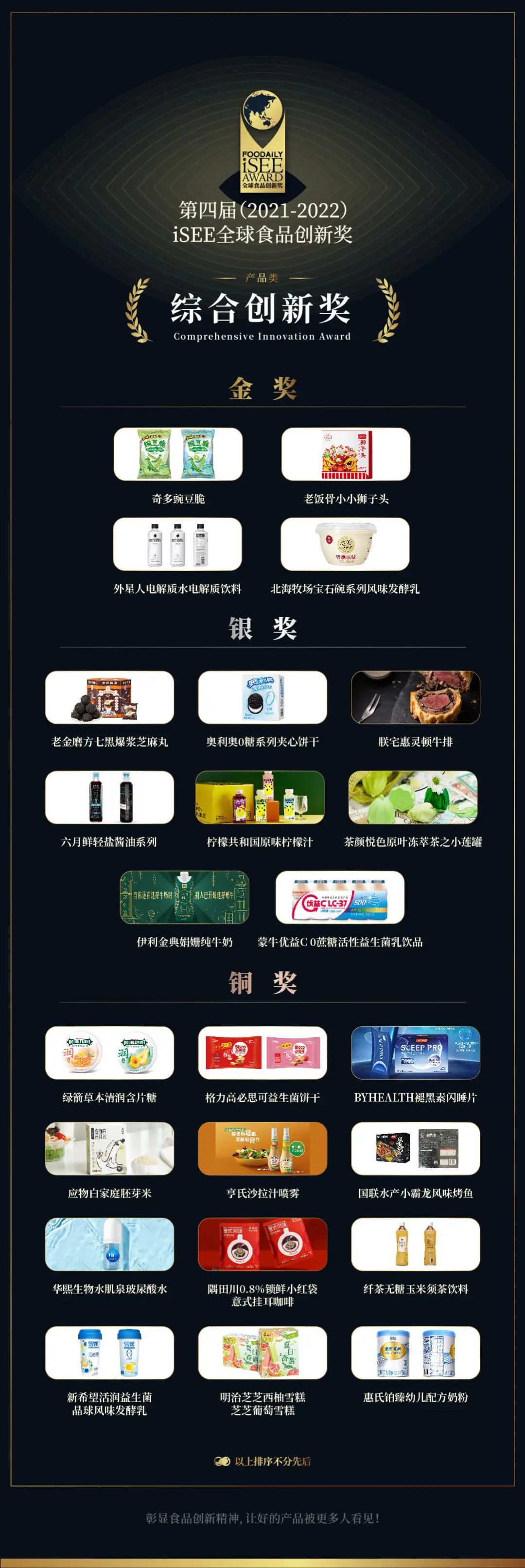 综合创新奖表彰的是在乳品类、饮料类、食品类、餐饮类中,依据iSEE奖6大评审维度,综合表现卓越的年度创新产品。本届获得综合创新奖金、银、铜奖的产品分别是: