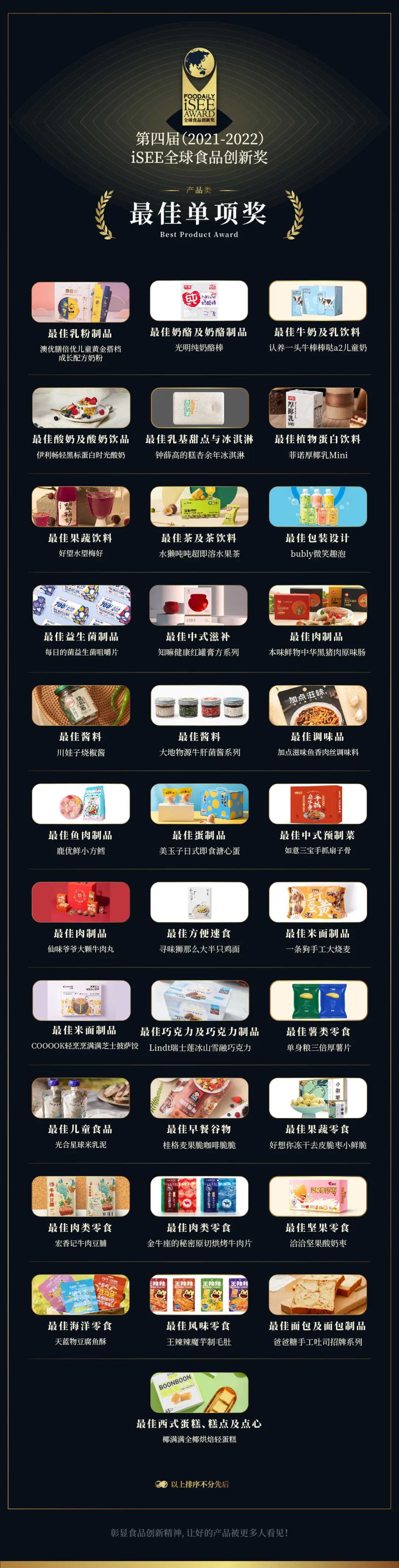 作为凝聚创新的最小颗粒度,产品类奖项旨在挖掘食品饮料行业中乳品类、饮料类、食品类、餐饮类的预包装创新产品,也是目前iSEE奖项中最大的类别,奖项设置分为最佳单项奖与综合创新奖。