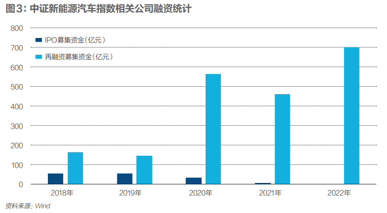 出行一客(ID:carcaijing)选取了中证新能源汽车指数相关标的公司,统计其近五年来的IPO和再融资情况。Wind数据显示,自2020年以来,标的企业的再融资额出现大幅增长。2020年,共有21家企业进行再融资,合计募集资金564亿元,同比增长285%。在2021年出现18%的下滑后,今年以来,再融资金额再度大幅攀升。截至7月28日,有11家标的企业完成定增,合计募集资金702亿元。