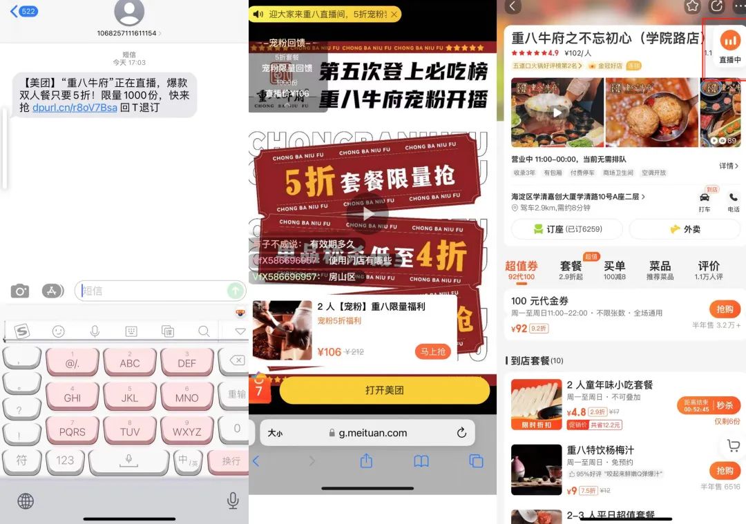 有美团用户发现,当商家在美团开播时,会收到商家正在直播的短信推送,点开链接后会进入商家的美团直播页面。不过,这点变化意义不大,美团对直播依旧佛系,3个月前,美团上线直播工具美团直播助手,但至今美团APP中尚无明显直播入口,大众点评APP中的入口也十分隐蔽。