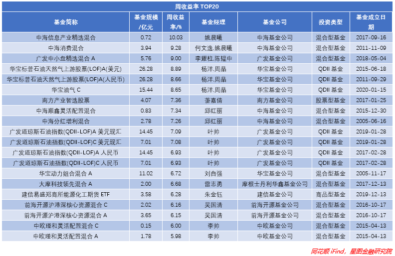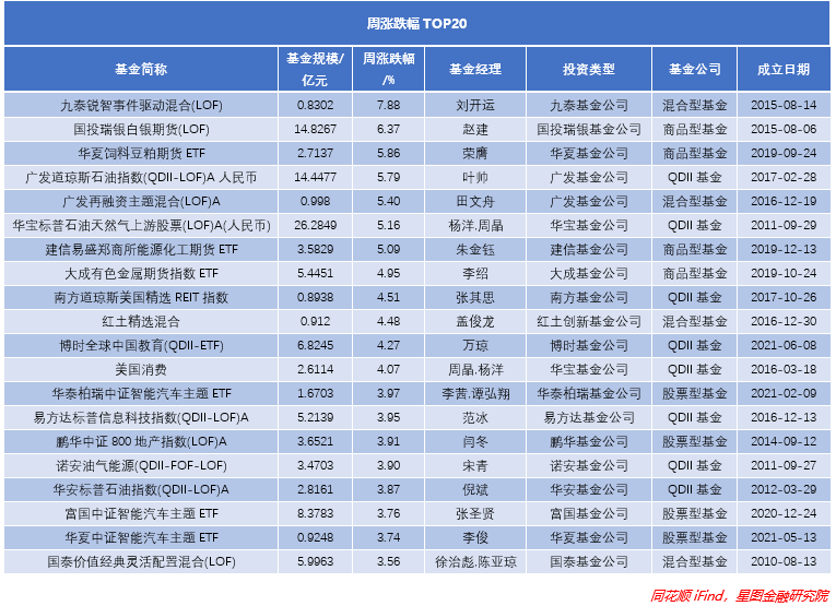 上周从涨跌幅来看,各种类型的基金全面开花,混基涨幅最高,QDII型基金数量最多,商品型基金表现也不错,但涨幅有所收窄,上周涨幅最高仅为7.9%,为九泰基金旗下的混基夺得周涨跌幅TOP20头筹。上周广发、华宝、华夏三家基金公司表现较好,入围基金均为2只。