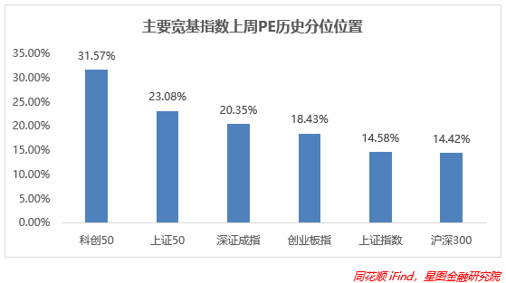 指数层面,上周多项指数估值较环比都有所下降。从分位值来看,科创50由于本周表现最好,所以估值进一步回升,上证指数和沪深300的PE最低,且沪深300估值下降明显,深证成指估值变动幅度最大,指数估值回落至20%的分位置附近,环比投资性价比进一步凸显。
