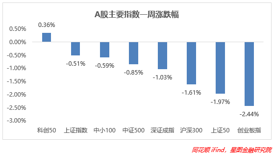 上周A股处于震荡行情,总体在3240点以上徘徊。从指数层面看,上周各大指数表现均比较差,风格相差不大,科创50领涨也是唯一收涨的指数,环比上涨0.36%,其余指数均有所回撤,其中创业板指跌幅扩大,为-2.44%,沪深300和上证50跌幅也较大,均超过了-1.5%,上证指数、中小100和中证500跌幅较小。
