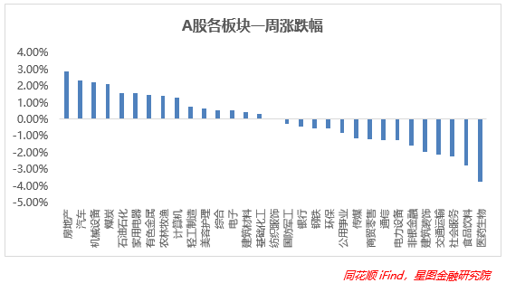 板块来看,上周各板块表现分化严重。其中房地产、汽车、机械设备、煤炭领涨,涨幅都在2%以上,医药生物、食品饮料、社服、交通运输等飘绿且跌幅均在2%以上。