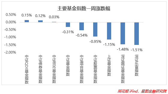 上周基金市场由阳转阴,大部分指数回撤明显。中证QDII基金指数涨幅有所收窄,为0.15%,债基指数涨势同样下挫,货基指数涨幅不变。上证基金指数、深证国基指数、深证乐富指数跌超1%,其余主要指数跌幅在-1%以内。