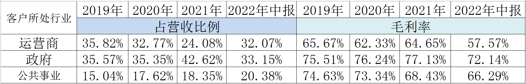 钛媒体APP发现,政府对公司营收、利润有着突出的贡献,其业务的下滑对公司业绩产生了较大的影响。资料显示,政府相关业务在2019年、2020年、2021年占营收的比例分别为35.57%、35.35%、42.62%,毛利率分别为75.51%、76.24%、77.13%,具体来看,政府业务在2019年占营收比例与运营商业务持平,2020年、2021年均位列第一,毛利率也一直是三个业务中最高的。由此可见,政府业务近三年对公司营收、利润方面贡献率较高。据悉,三个业务2022年上半年的营收分别为1.18亿、1.22亿、0.75亿,分别同比增加1.3%、-27.67%、-14.26%,占营收比例分别为32.07%、33.15%、20.38%,毛利率分别为57.57%、72.14%、66.29%。可见,政府业务作为对营收贡献最大、毛利率最高的业务,营收下滑幅度却最大,因此政府业务大幅减少是上半年业绩不佳的主要原因。