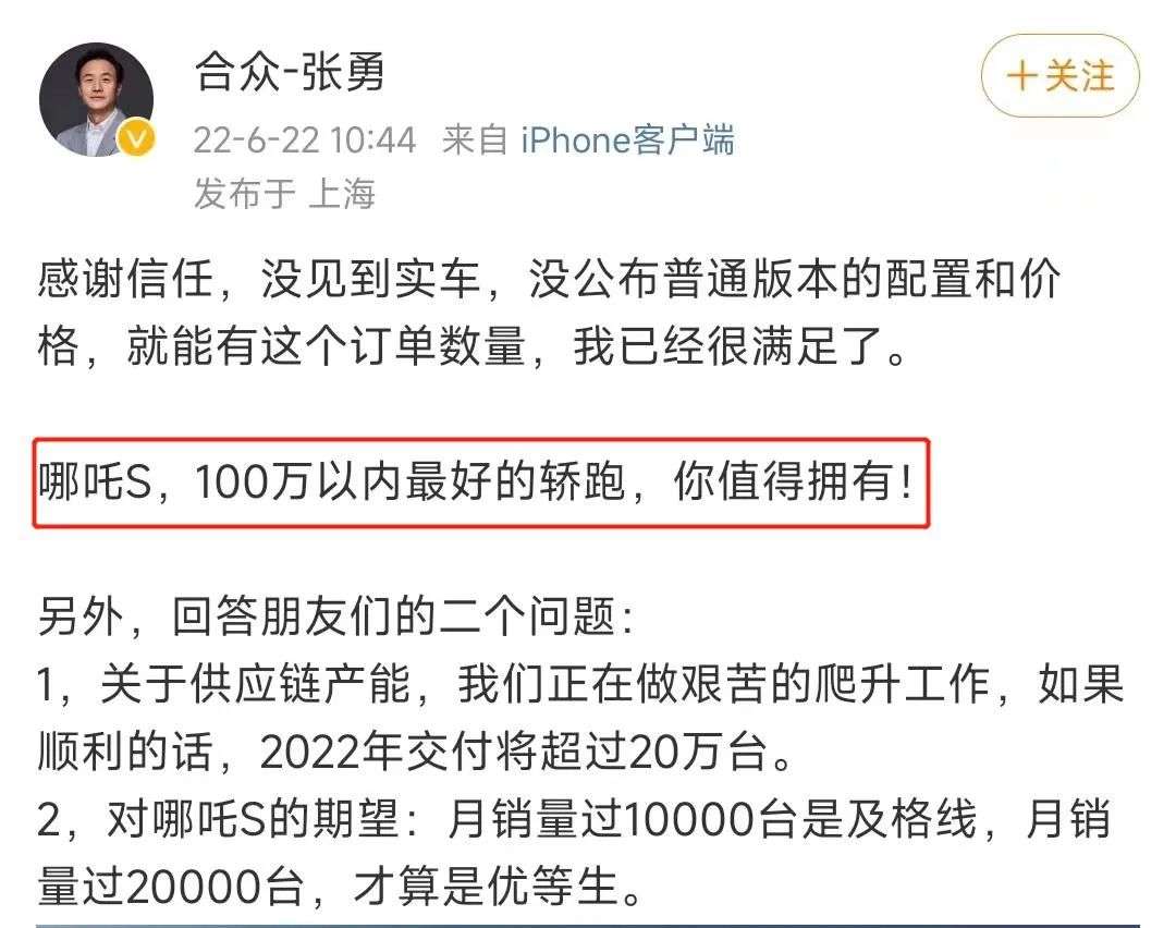 由此,在今年6月张勇曾评价哪吒S是“100万元以内的最好的轿跑”;而在提及销量方面,张勇在上市发布会上表示,基于哪吒S的助力,哪吒要在今年内拿下造车新势力销量第一的宝座。