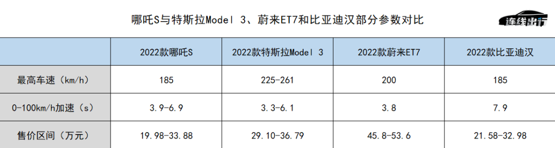 哪吒S与特斯拉Model 3、蔚来ET7和比亚迪汉部分参数对比,数据来源于汽车之家,连线出行制表