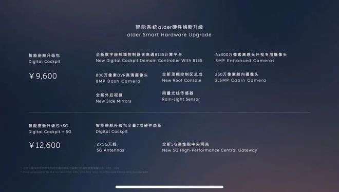 其中,蔚来的硬件升级计划相比其他车企的价格更贵,共提供9600元或12600元人民币的两种选择,第一套为智能座舱升级包,包括高通8155芯片、四颗300万像素摄像头、800万行车记录仪等。第二套则为5G版智能座舱升级包,在前者的基础上增加了5G天线和5G中央网关。这两项硬件升级计划主要针对老款的ES8、ES6、EC6。