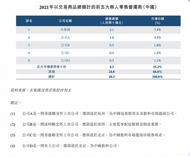今年5月底,国内自动售货机「一哥」友宝赴港上市,其招股书披露中国前五大无人零售运营商中,公司A以10亿元销售总额、3.5%市场份额,成为其最大的竞争对手,这家公司就是农夫山泉。