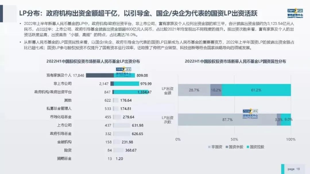 另一方面,募资结构严重分化——国资产业基金成为主力军,民营投资机构举步维艰。这也可以从LP层面略窥一二:政府机构出资金额超千亿,以引导金、国企/央企为代表的国资LP出资活跃,成为人民币基金的重要募资方。2022年上半年国资LP的披露出资金额占比已超过7成。