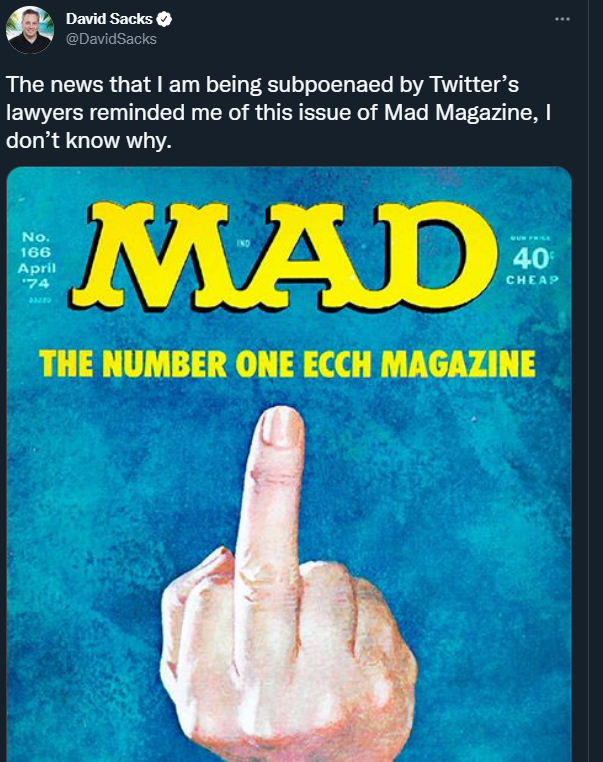 “lol,Twitter 的律师给我们几个生态系统的好朋友发了传票,这简直是一次巨大的骚扰钓鱼骗局。我跟这次交易没有关系,除了几条刻薄的吐槽而已,但 Twitter 居然用这样强硬的语气……”