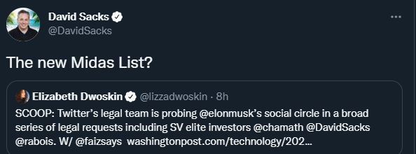 而马斯克的这群狐朋狗友呢?他们已知参与了交易的只有 Andreessen 和 Calacanis,其他人根本没有掏钱,纯粹就是站在外围吃瓜而已……结果居然被 Twitter 拿来祭旗了。