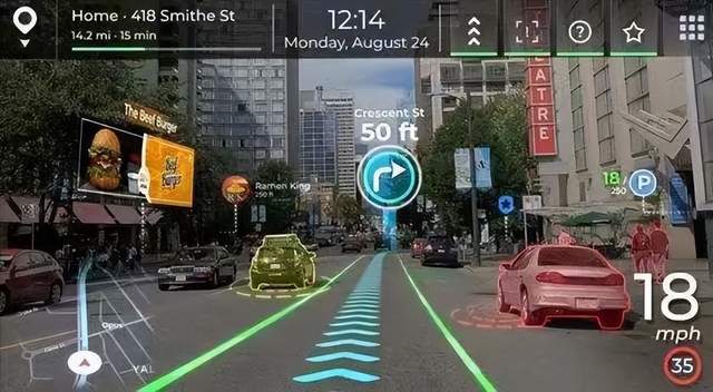 也有一些企业试图先将前挡风玻璃变成汽车元宇宙的入口。2022年,松下在CES展上展出了具有眼球追踪专利的AR-HUD 2.0系统,目前汽车上所搭载的HUD系统基本只能呈现时速、导航等一些重要的行车信息,但松下的AR-HUD 2.0系统可以将AR图标更精确地聚焦到驾驶员眼前的现实世界,提高驾驶员视野中图像的真实程度和临场感,看起来颇有一种赛博朋克的感觉。