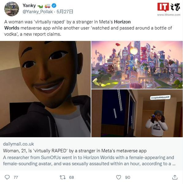2022年5月底,元宇宙“性侵”事件引发关注。受害者是一名21岁的女性,她在科技巨头Meta发布的元宇宙概念在线游戏《地平线世界(horizon worlds)》中创建的女性虚拟形象被一名男性玩家“性侵犯”,由于虚拟人物的接触能使得玩家手中的控制器产生振动,受害者感到非常不适。