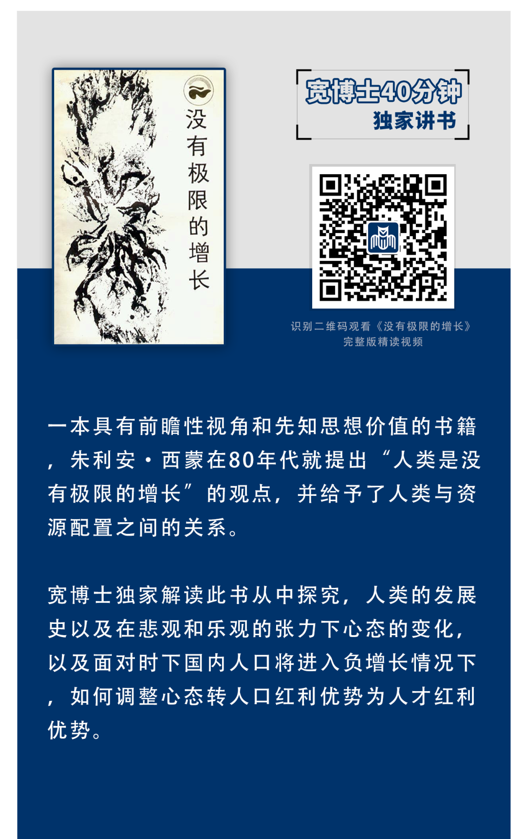 宽博士独家解读《没有极限的增长》从作者的表达中探究,人类的发展史以及在悲观和乐观的张力下心态的变化,并倡导大家怀有乐观的态度,积极发展拥抱未来,而当我们持有悲观态度的时候,则需要积极地解决问题,而不是抱怨和杞人忧天。