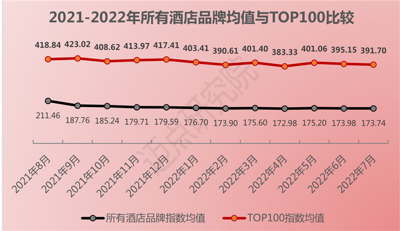 7月百强榜单和整体酒店品牌指数均呈现小幅下降态势,2022年7月TOP100品牌值均数为391.70,环比下降0.87%,整体酒店品牌指数均值173.74,环比下降0.13%。但整体品牌指数均值与TOP100仍呈现较大差距,反映出头部品牌在市场认可度和品牌投资方面的价值红利。