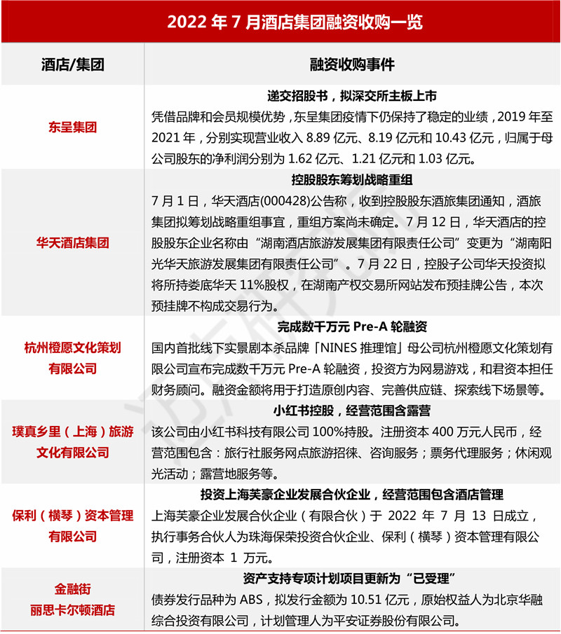 迈点研究院不完全统计,2022年上半年每月均有15起以上酒店资产交易事件,疫后资产腾挪速率提升。仲量联行数据显示,亚太地区酒店业持续复苏,2022年上半年的投资总额达到68亿美元,同比增长33%,相比2019年同期增长12%。今年上半年的交易量为75笔,同比下降20.2%,仅为2019年同期的33%,不过涉及的客房数量接近2万间,同比增长30%,相比2019年上半年也高出9.4%。7月,广西东呈酒店管理集团股份有限公司递交招股书,拟深交所主板上市。疫情证明连锁酒店集团预防和抗御风险的能力更强,有能力对加盟商给予金融支持和管理辅助措施,酒店连锁集团扩增规模呈现快速发展机会。