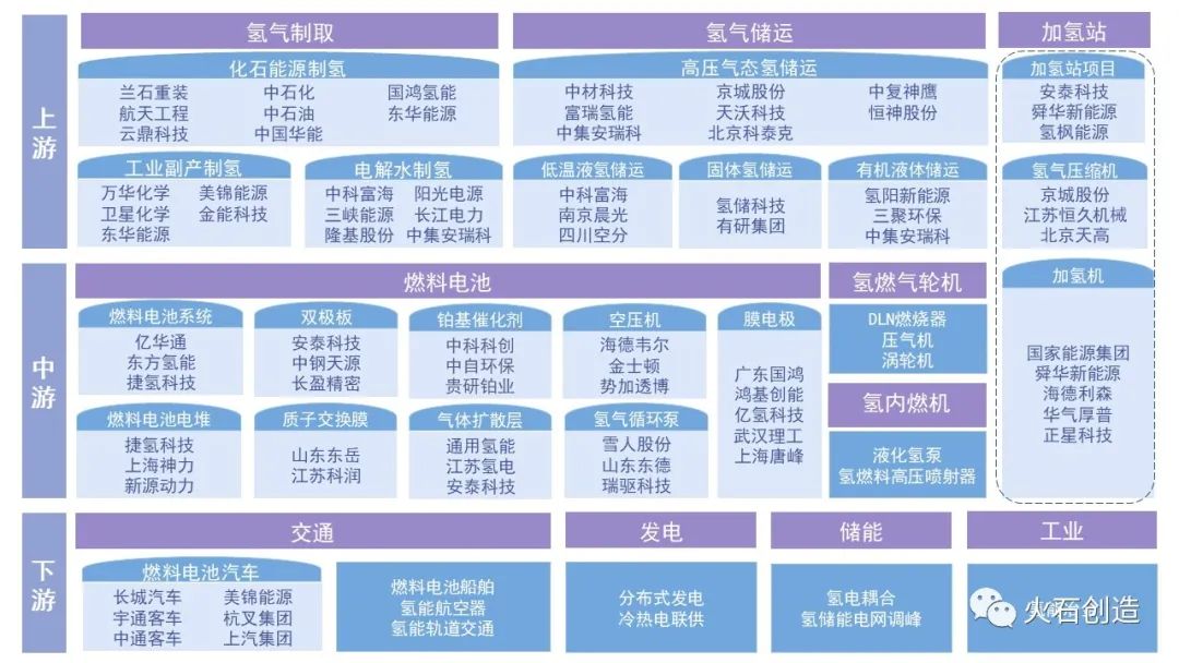 能源端包括氢气制取、氢气储运和加氢站;产品端包括燃料电池、氢燃气轮机和氢内燃机,目前燃料电池技术是氢能产业发展的重点和难点;应用端主要体现在交通、发电、储能和工业等领域上,其中交通领域中的燃料电池汽车是氢能最主要的应用,越来越多的汽车厂商开始在燃料电池汽车领域布局。