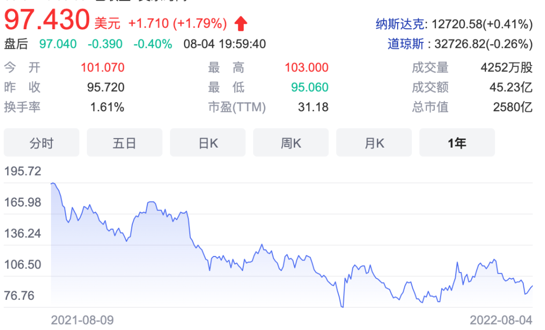 阿里巴巴近一年股价(美股)
