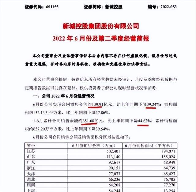 据新城控股发布的经营简报,2022年1-6月份,公司累计合同销售金额约651.60亿元,比上年同期下降44.62%;累计销售面积约657.20万平方米,比上年同期下降39.54%。